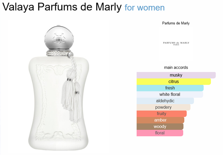 عطر ادکلن والایا از پارفومز د مارلی یک عطر گلی میوه ای است زنانه که در سال 2023 به بازار عرضه شد. سازنده این عطر Quentin Bisch است. نت های اولیه آلدئید، هلو سفید، ترنج و پرتقال ماندارین هستند. نت های میانی عبارتند از شکوفه پرتقال، گلبرگ، زنبق دره، نیمفیل، خس خس و ماهونیا. نت های پایه مشک، آمبروکسان، چوب آکیگالاو و وانیل هستند.
